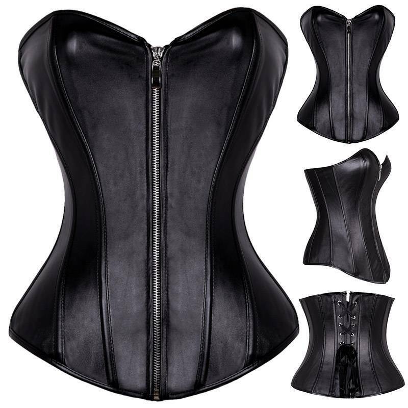Women Faux Leather Steampunk Corset Top Punk Rock Bustier Buckle-up Overbust Basque with G-string.