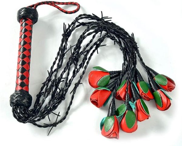 Bare Sutra Red Rose Cow Floggers | Handmade Thorn Cowhide Leather Whip | A Red Rose with Green Petals Strings | 22.6” Long 9 Braided Tails & Sturdy Handle Inside Wood | Beautiful 36″ Black Red Green