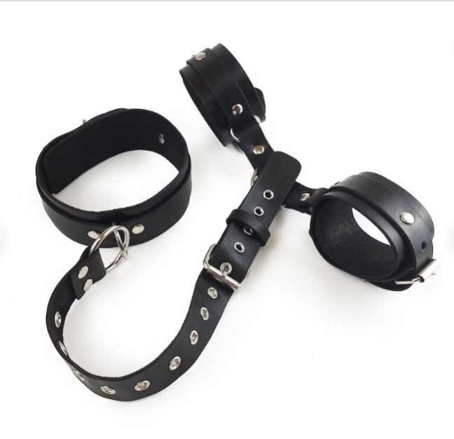 Leather Bondage Set for you . Collar, Handcuffs and double fixation.